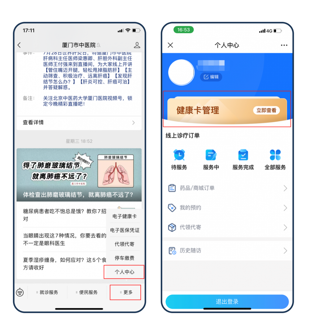 ① 点击菜单栏【更多】-【个人中心】,选择【健康卡管理】。