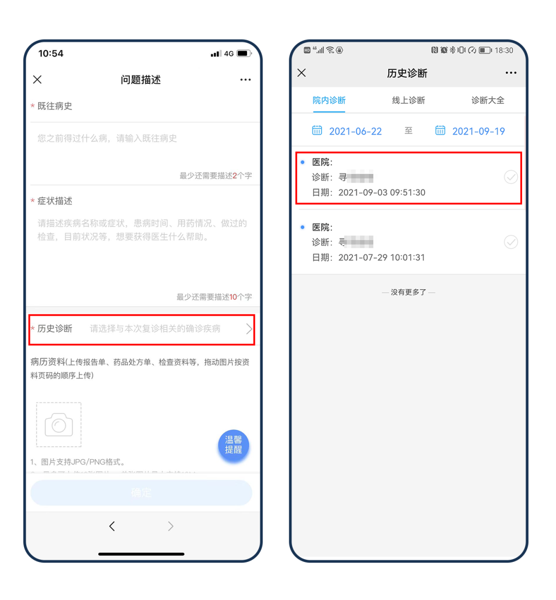 ③ 症状描述,并选择历史诊断。仅复诊患者方可使用线上问诊(复诊:三个月内在本科室线下门诊有该疾病的就诊记录)。