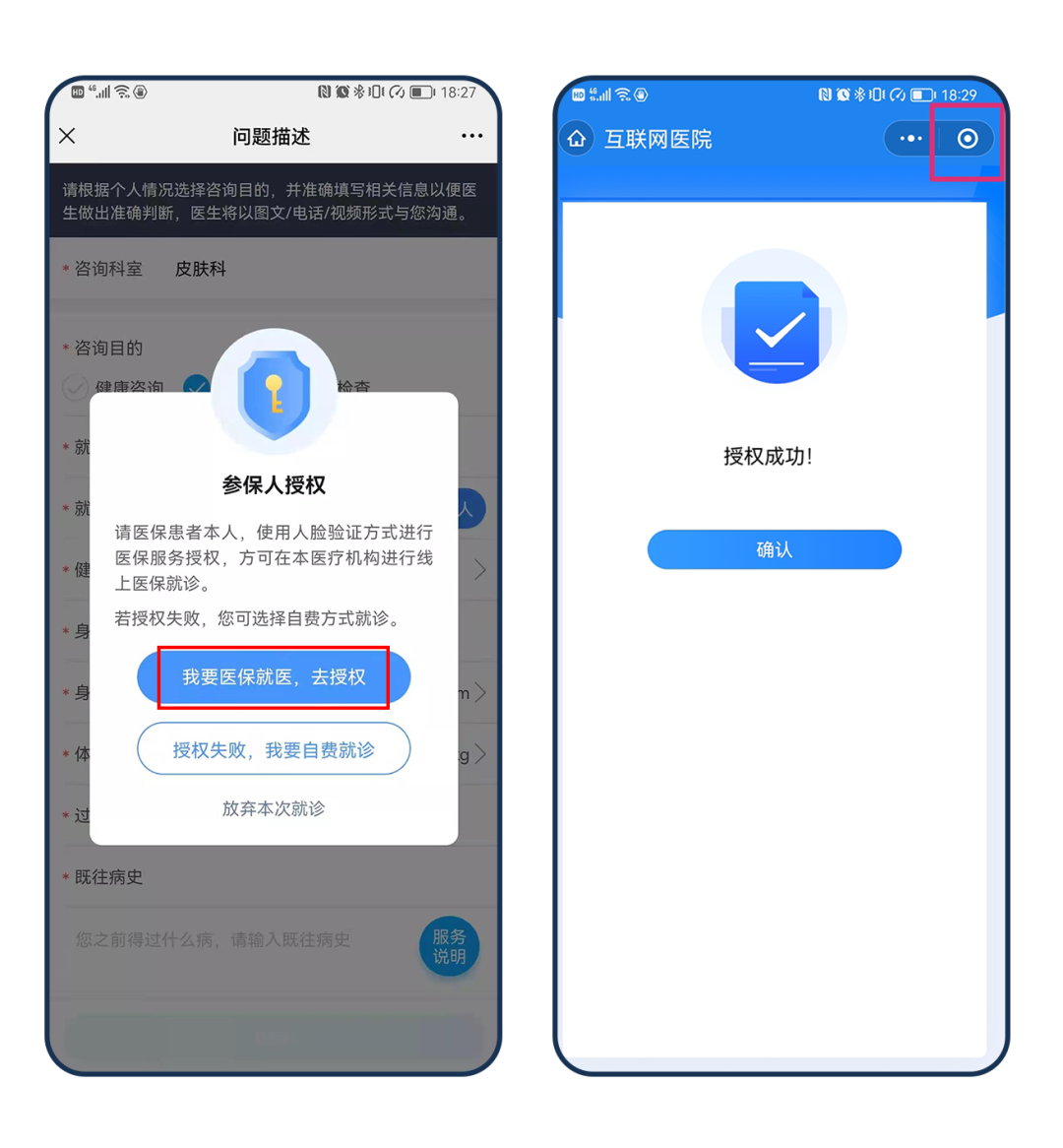 ① 选择科室、医生后,点击【在线问诊】,进入问诊页面,需选择就诊人,参保患者就诊选择【医保】。