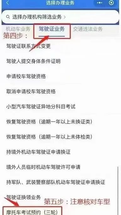 第五步选择“摩托车考试预约”(摩托车考试预约分二轮和三轮,选择时注意核对车型);