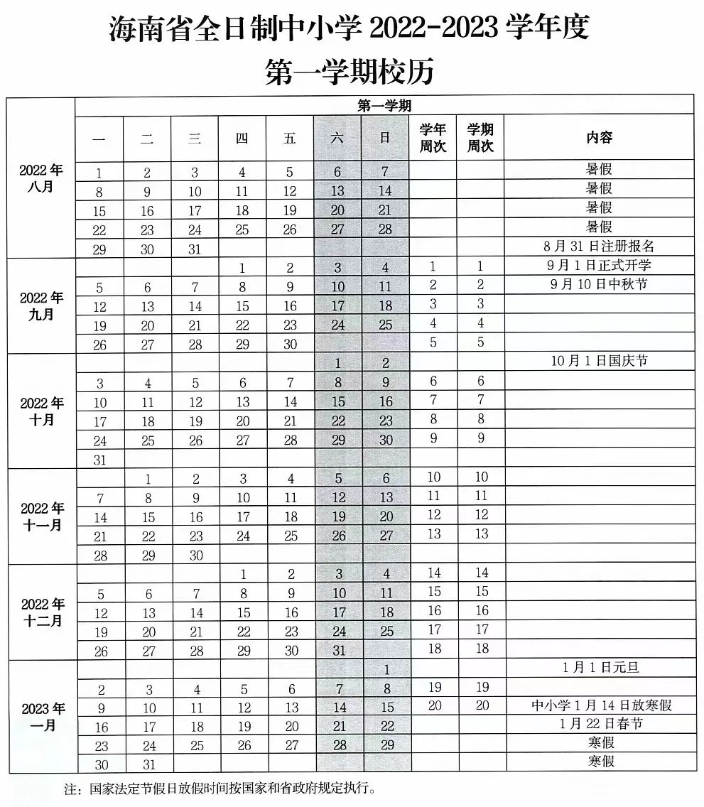 根据《海南省全日制中小学2022-2023学年度校历》,海南省中小学秋季学期开学时间为: