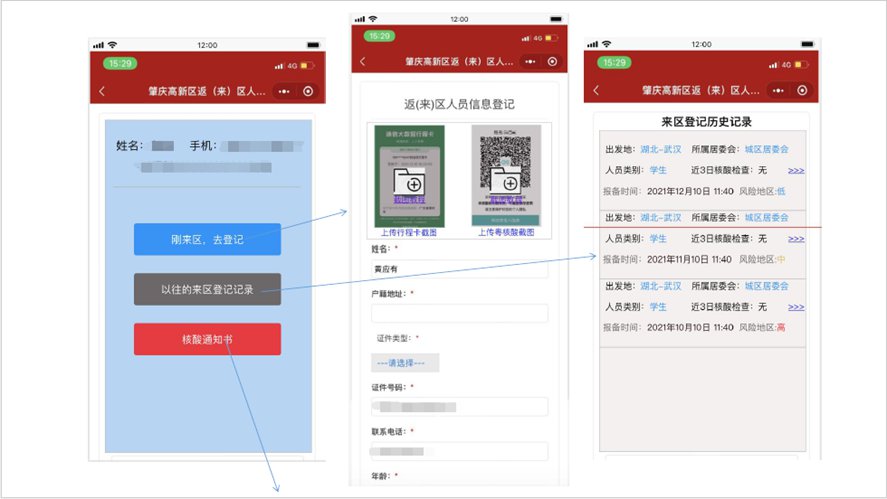 为积极应对新冠肺炎疫情防控,方便来(返)区人员报备,肇庆高新区现已优化来区报备系统,市民只需通过手机在智慧大旺小程序扫码,进行线上填报,即可轻松完成来(返)区登记报备。