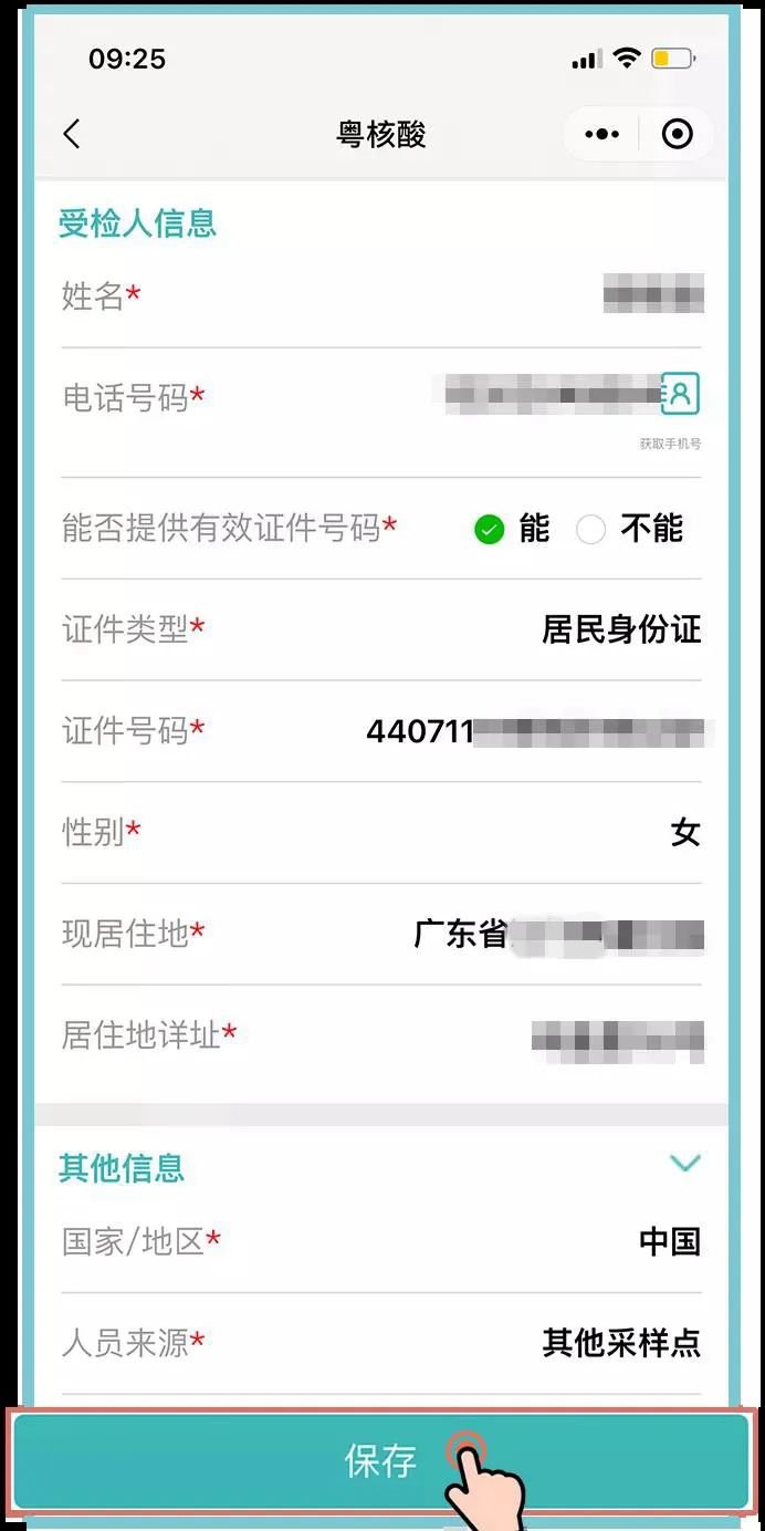 5、填写个人信息:姓名、电话号码(手机)、证件类型、证件号码、性别、现居住地、居住详细地址等(红色*号选项属于必填选项)务必正确填写个人信息,否则平台上可能查询不到核酸检测结果!