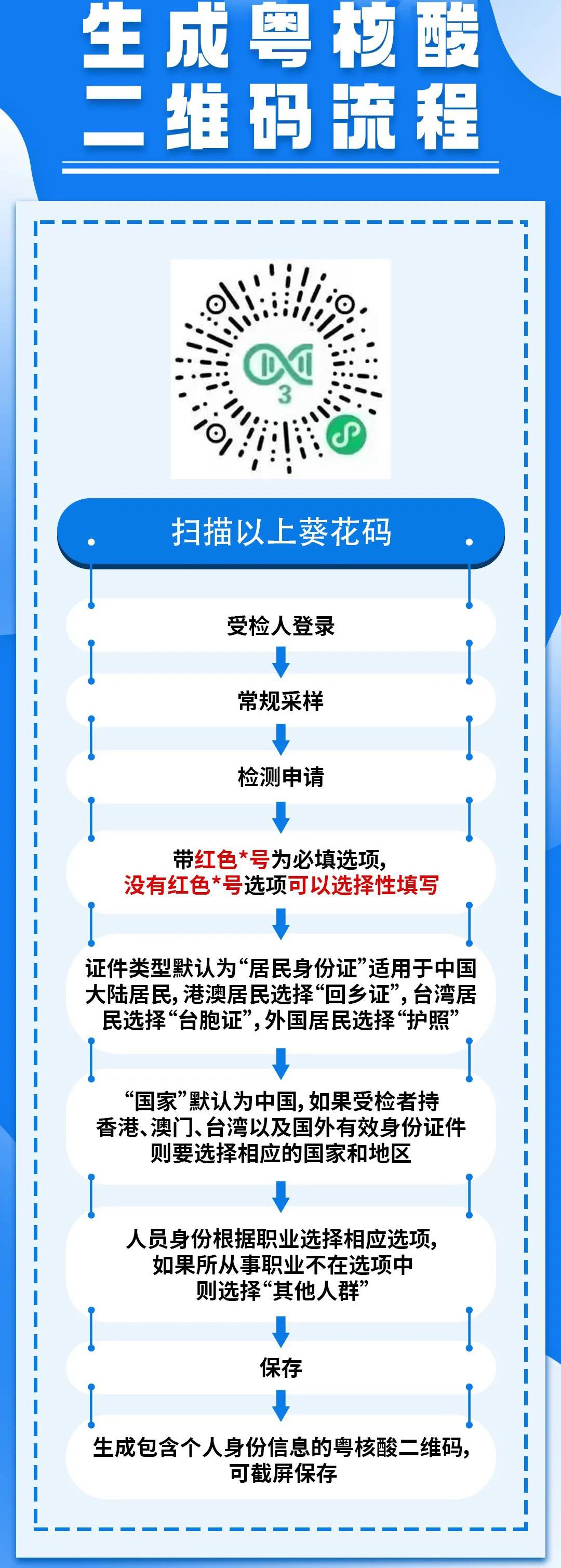 2022年1月20日起,广东省内核酸检测信息需要通过“粤核酸”小程序录入,建议在家里可以先完成个人信息录入,生成并截图保存粤核酸二维码,到医院采样时,直接出示粤核酸二维码即可,以节省来院时填报的时间。