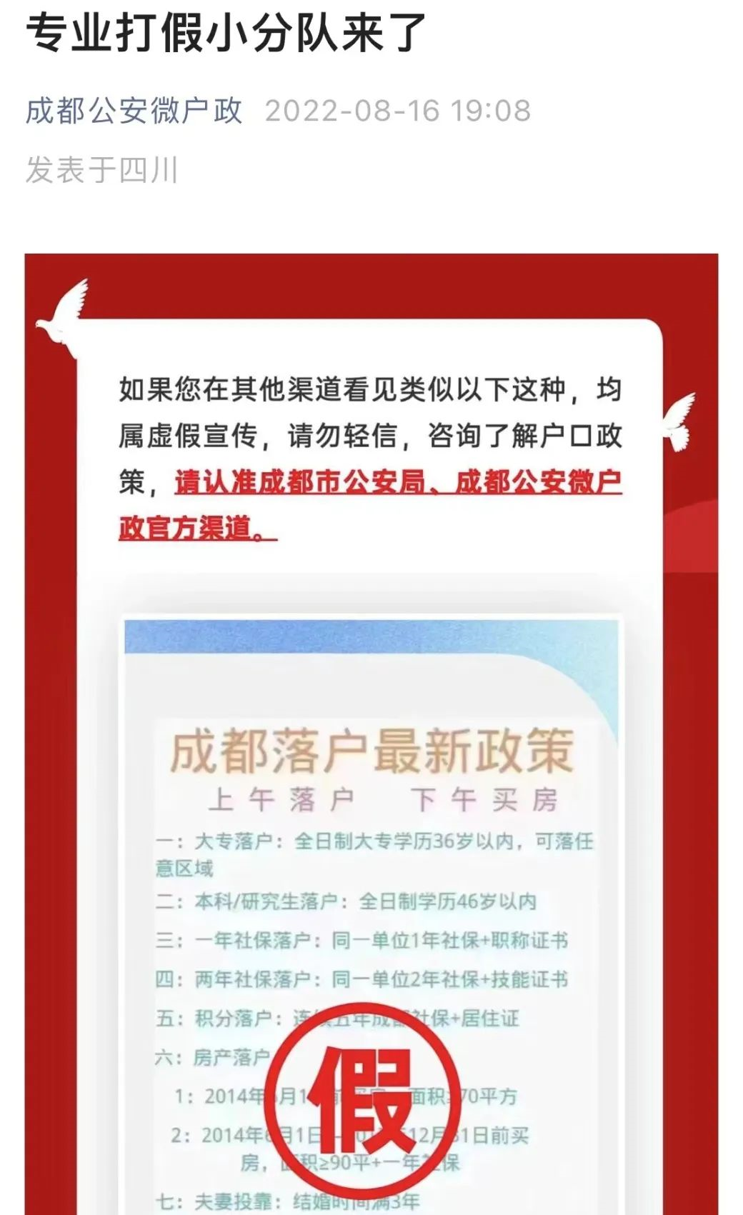 对此,8月16日“成都公安微户政”官微发布信息表示,此类信息均属虚假宣传,请勿轻信。咨询了解户口政策,请认准成都市公安局、成都公安微户政官方渠道。