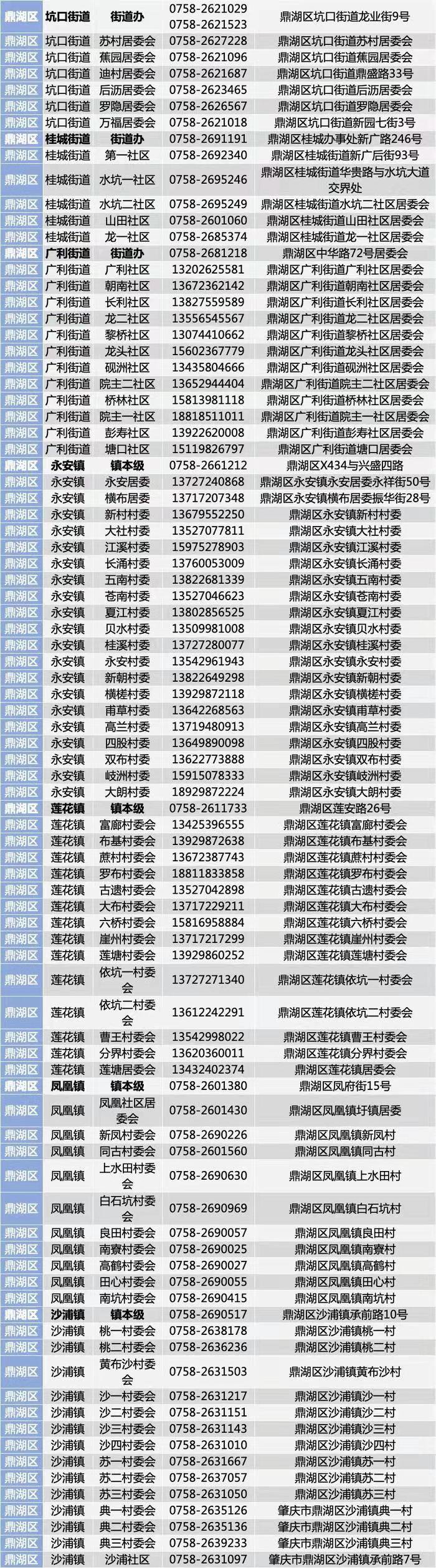 肇庆市鼎湖区社区街道(村委)电话