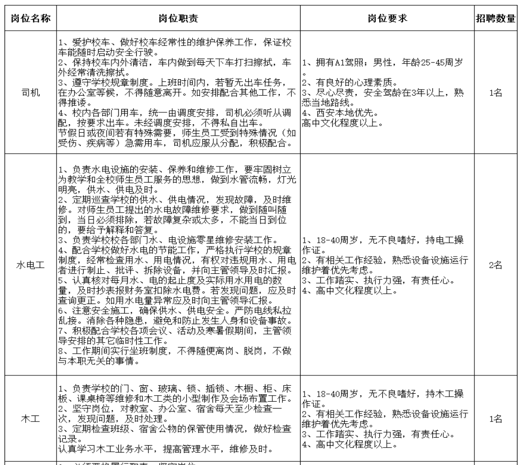 1.后勤管理处招聘司机、保安及水电维修工等6名工作人员。