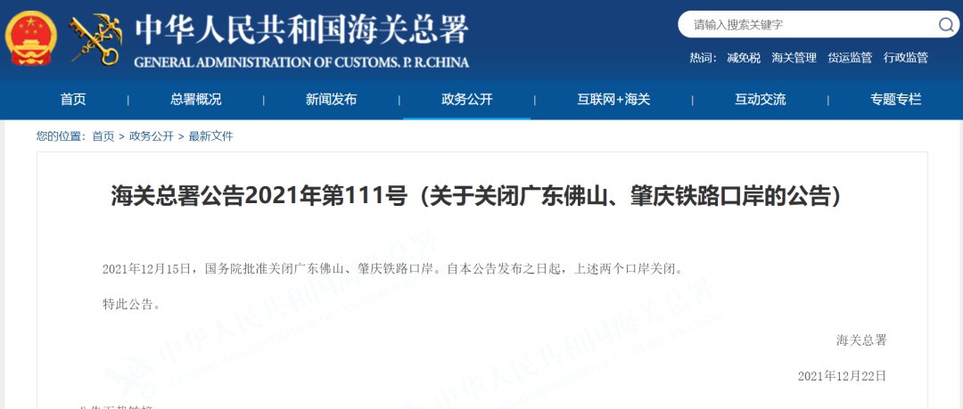 海关总署网站22日消息,海关总署公告,2021年12月15日,国务院批准关闭广东佛山、肇庆铁路口岸。自本公告发布之日起,上述两个口岸关闭。