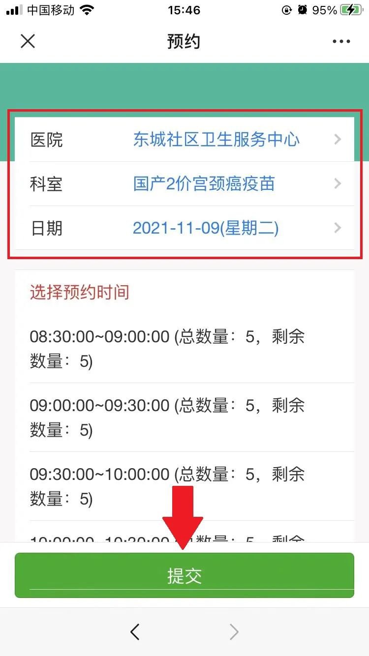 第四步:选择医院、科室(疫苗种类)、日期、预约时间,点击提交,提交后代表预约