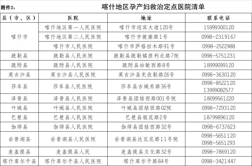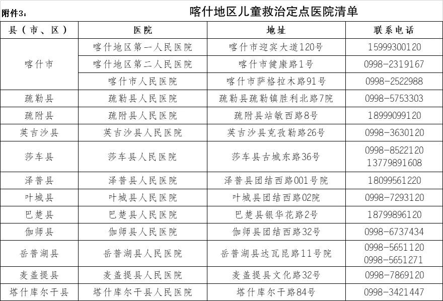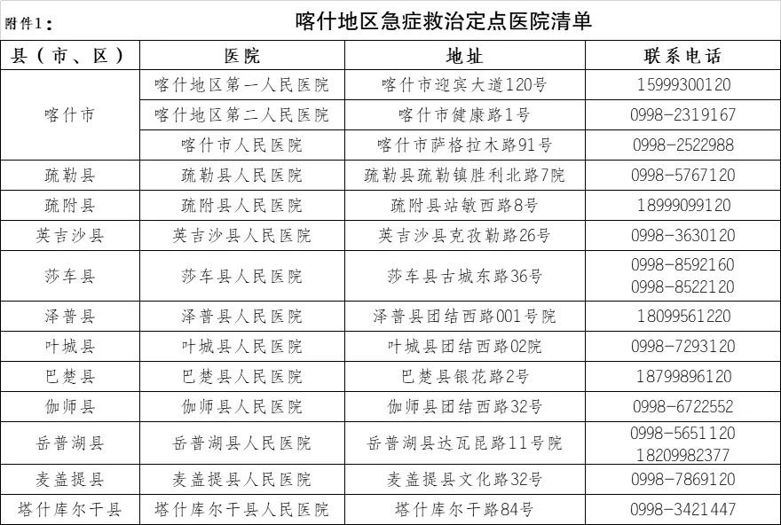 疫情期间喀什地区急危重症患者救治定点医院名单