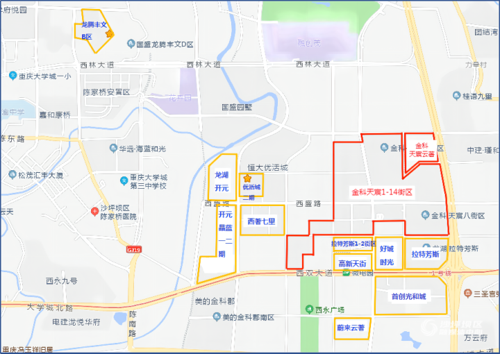 天星桥街道、小龙坎街道、渝碚路街道、土湾街道,以及覃家岗街道新立社区、马家岩社区图示