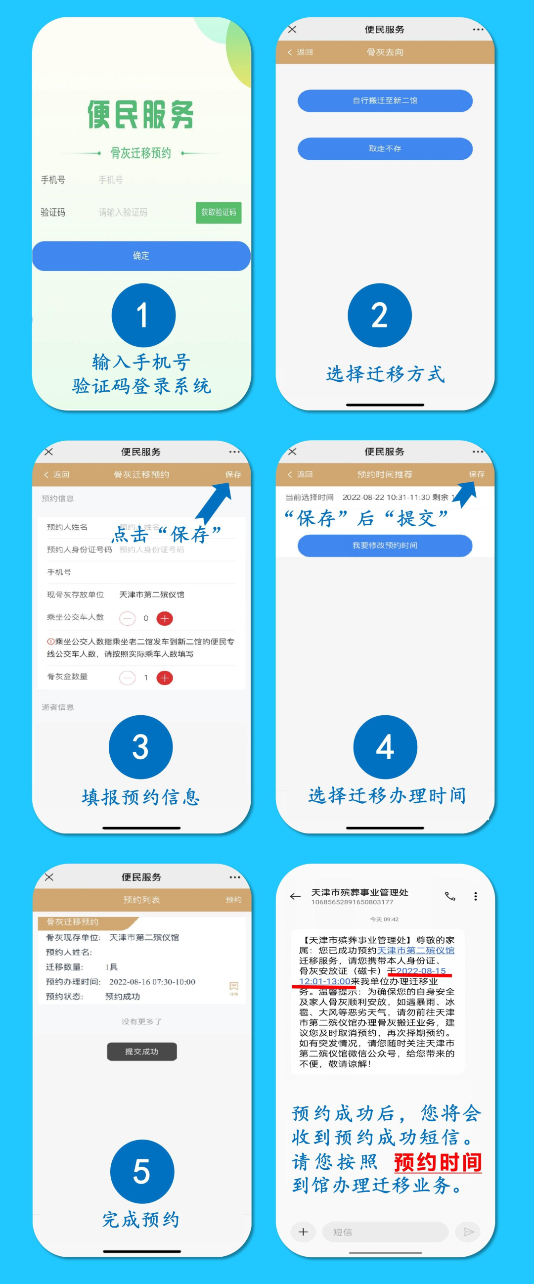 办理骨灰迁移手续需要提前网上预约,家属可通过天津市民政局官网、“天津殡仪服务”微信公众号、“天津市第二殡仪馆”微信公众号或“津心办”(APP、微信小程序)按照操作提示进行网上骨灰迁移预约。