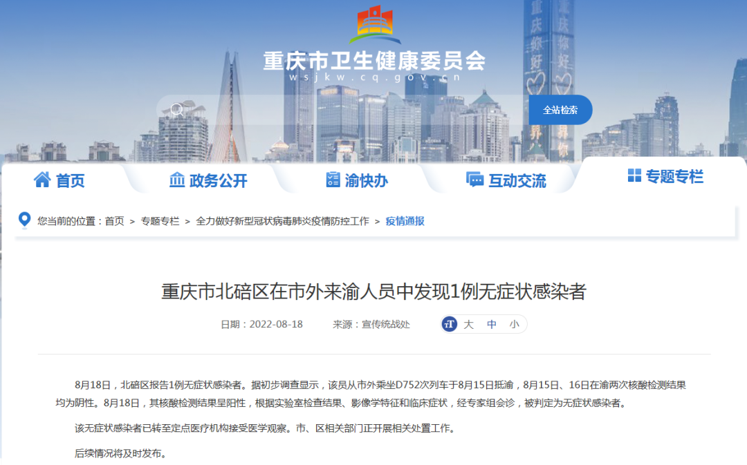 8月18日,北碚区报告1例无症状感染者。据初步调查显示,该员从市外乘坐D752次列车于8月15日抵渝,8月15日、16日在渝两次核酸检测结果均为阴性。8月18日,其核酸检测结果呈阳性,根据实验室检查结果、影像学特征和临床症状,经专家组会诊,被判定为无症状感染者。