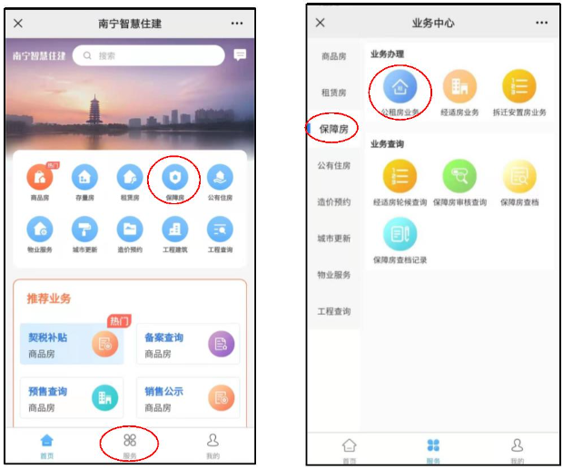 1、点击“保障房”或者“服务”菜单,进入“业务中心”页面,选择“公租房业务”。