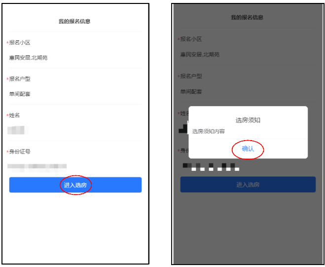 3、确认“报名信息”,点击“进入选房”阅读“选房须知”,点击“确认”。