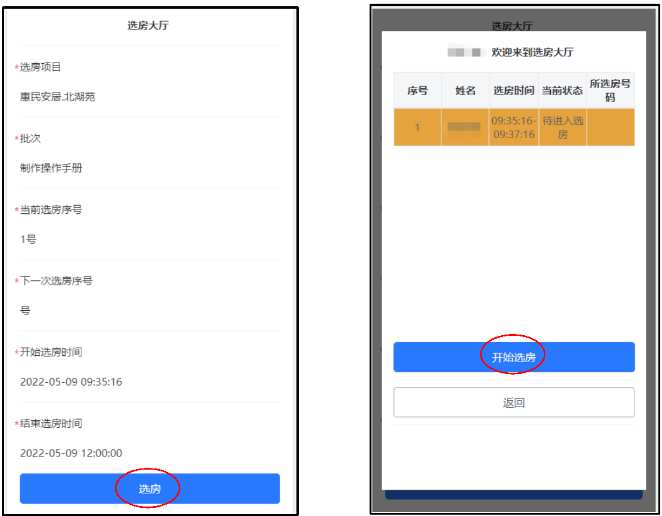 4、点击“选房”进入选房大厅,等待选房,当等到自己的选房时间后,点击“开始选房”进入选房。