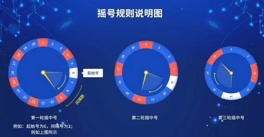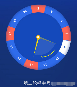 第二轮:紧接上一轮4号中签后,跳过5号、7号(6号已中签,抽出),8号第八个中签,跳过10号、11号,13号第九个中签(9号、12号已中签,抽出)。以此类推,本轮共产生8号、13号、17号、2号、7号,共5个中签号码,抽出,不参与间隔数计算。