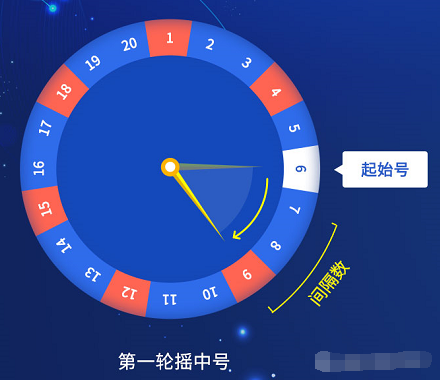 第一轮:6号第一个中签,跳过7号、8号,故9号第二个中签,再跳过10号、11号, 12号第三个中签。以此类推,本轮产生6号、9号、12号、15号、18号、1号、4号,共7个中签号码,抽出,不参与间隔数计算。