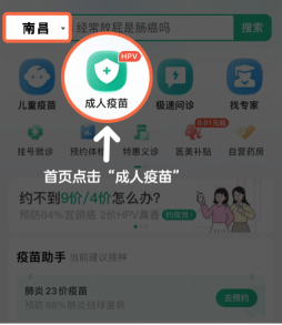 2、下载后,选择“南昌”地区,点击 “成人疫苗” ,点击“抢苗助手”。