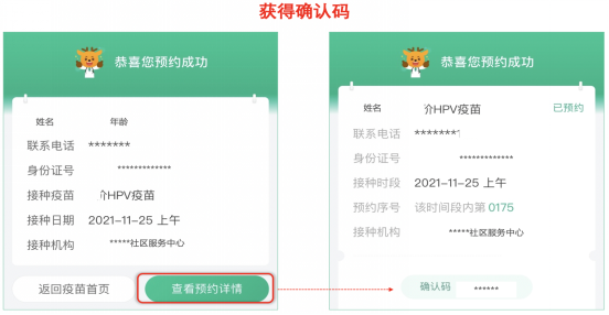 预约成功后,点击“查看预约详情”,获得确认码,之后请携带相关证件,按预约时间准时前往接种点接种。