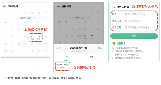 温馨提醒:HPV疫苗目前关注用户众多,该状况下,此次开放的疫苗极有可能会短时间内被迅速预约完,如本次未能预约上,敬请理解!以上图示仅作示范,预约以实际情况为准!