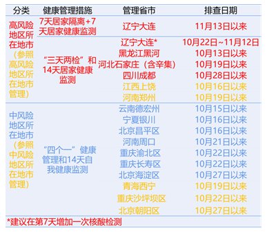 3.辽宁省大连市:11月13日起开展7天居家隔离+7天居家健康监测;10月22日~11月12日执行三天两检+14天居家健康监测,建议在第7天增加一次核酸检测。