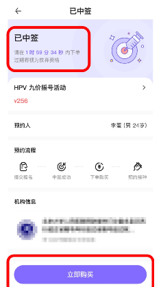 5、等待微信“丁香医生”订阅号及短信通知,如中签,有三种方式可前往下单预约接种时间:①点击微信消息内容,②短信链接,③或”丁香医生”首页下方点击“我的”,选择“摇号信息”。在规定的时间内点击“立即购买”预约接种时间。(注:线上无需付款,疫苗费用在医院支付)