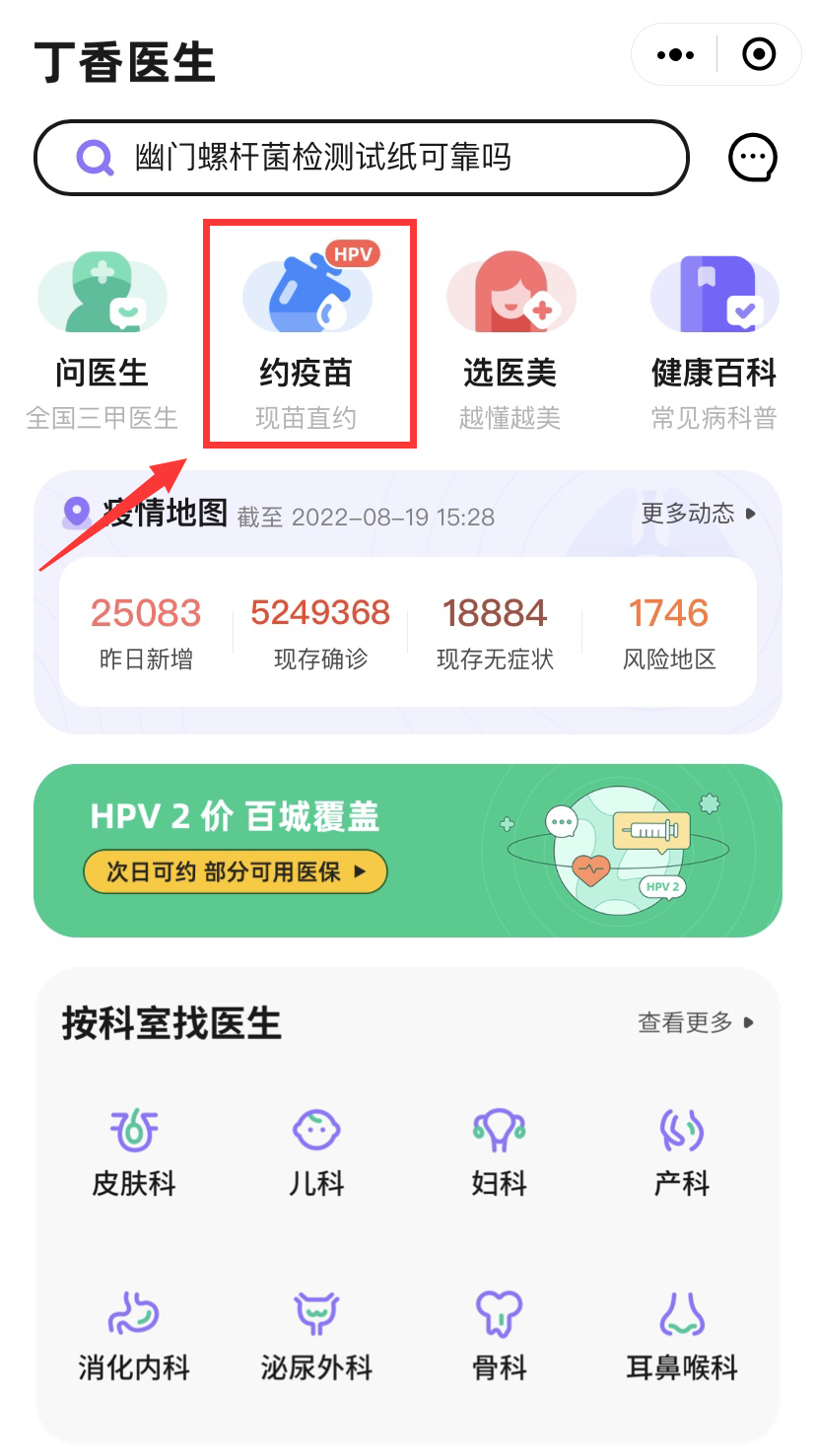 1、预约入口:点击扫码,进入丁香医生小程序。
