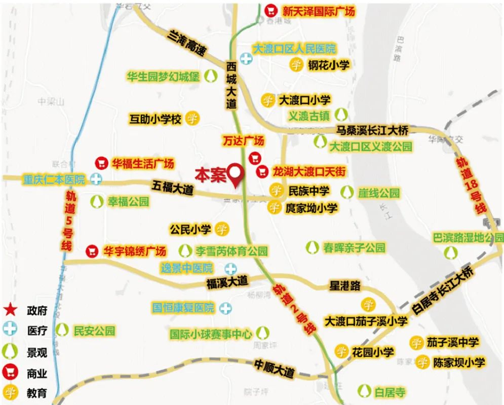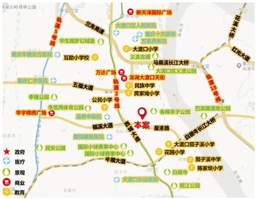 商业:龙湖大渡口天街、万达广场、华宇锦绣广场、大江商业广场。
