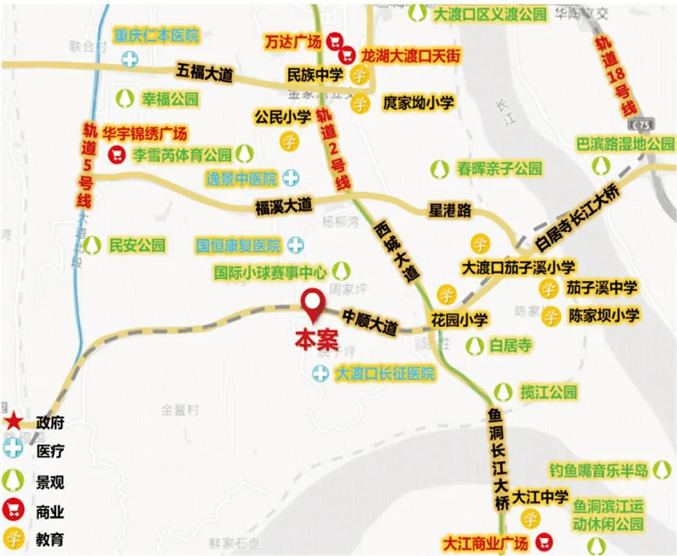 交通:五福大道、福溪大道、西城大道、星港路、中顺大道、白居寺长江大桥、鱼洞长江大桥等主干道网;轨道2号线已全线运营,轨道5号线部分通车,18号线预计2023年建成通车。