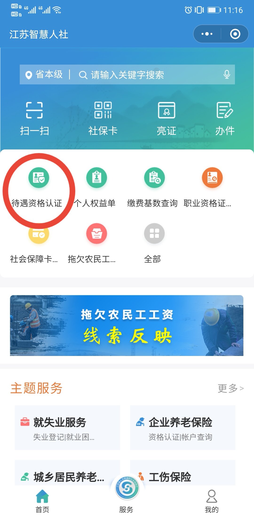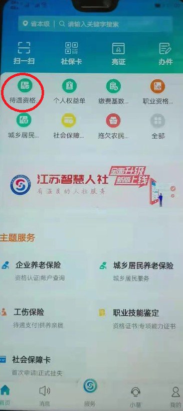 1、手机端下载并登录“江苏智慧人社”APP,点击“待遇资格认证”。