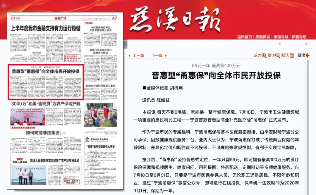 连宁波日报头版、慈溪日报也有ta大家都在给“甬惠保”打call通民情、接地气,利国利民!