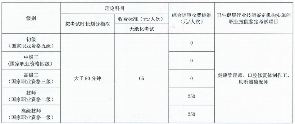 (一)理论科目考试费为无纸化考试,根据国家卫生健康行业职业技能鉴定考试标准和题库等规定的考试时长,收费标准按“大于90分钟”档次划分(见下表)。