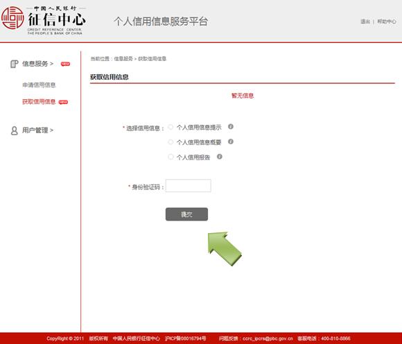 提交查询申请后的24小时后,用户登录平台,点击"信息服务"—"获取信用信息",输入平台发送到用户手机上的身份验证码,点击"提交"。