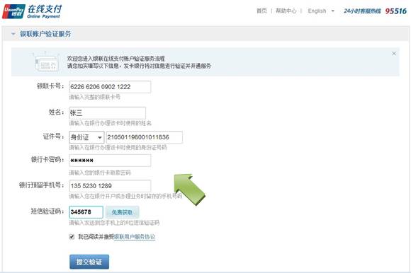 ③进入到银联系统,输入银行卡信息,点击"提交验证"。