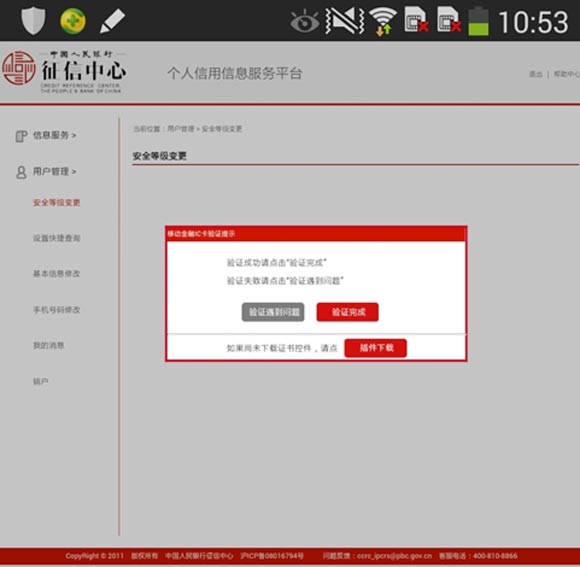 在进行安全等级变更、查询信用报告、修改手机号码、开通快捷查询、重置密码、销户等操作时,用户需进行身份验证。目前共有四种身份验证方式:银行卡验证、数字证书验证、问题验证和移动金融IC卡验证。使用电脑访问平台时,可选择银行卡验证、数字证书验证和问题验证三种验证方式;使用手机浏览器访问平台时,可选择问题验证和移动金融IC卡验证两种验证方式。