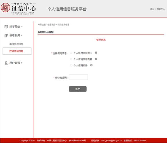提交查询申请后的24小时后,用户登录平台,点击"信息服务"—"获取查询结果",输入平台发送到用户手机上的身份验证码,查看选择的信用信息产品。