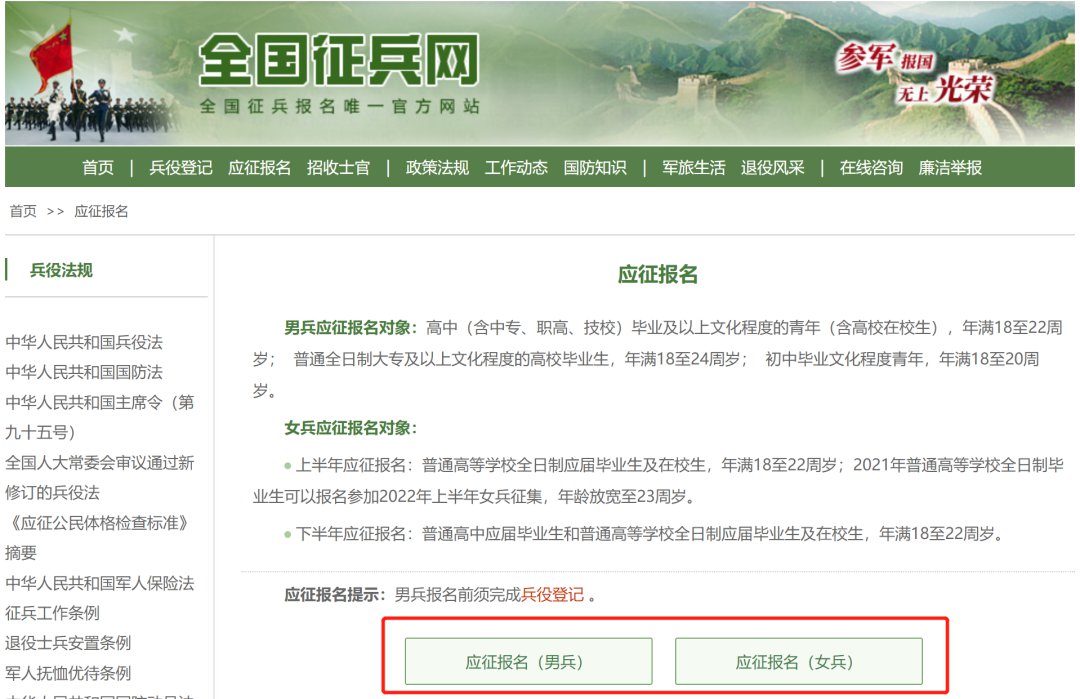注意:男兵报名需要完成兵役登记。如果你是第一次来,要先进行登记,点击【应征报名(男兵)】后,会有系统提示你进行登记的。