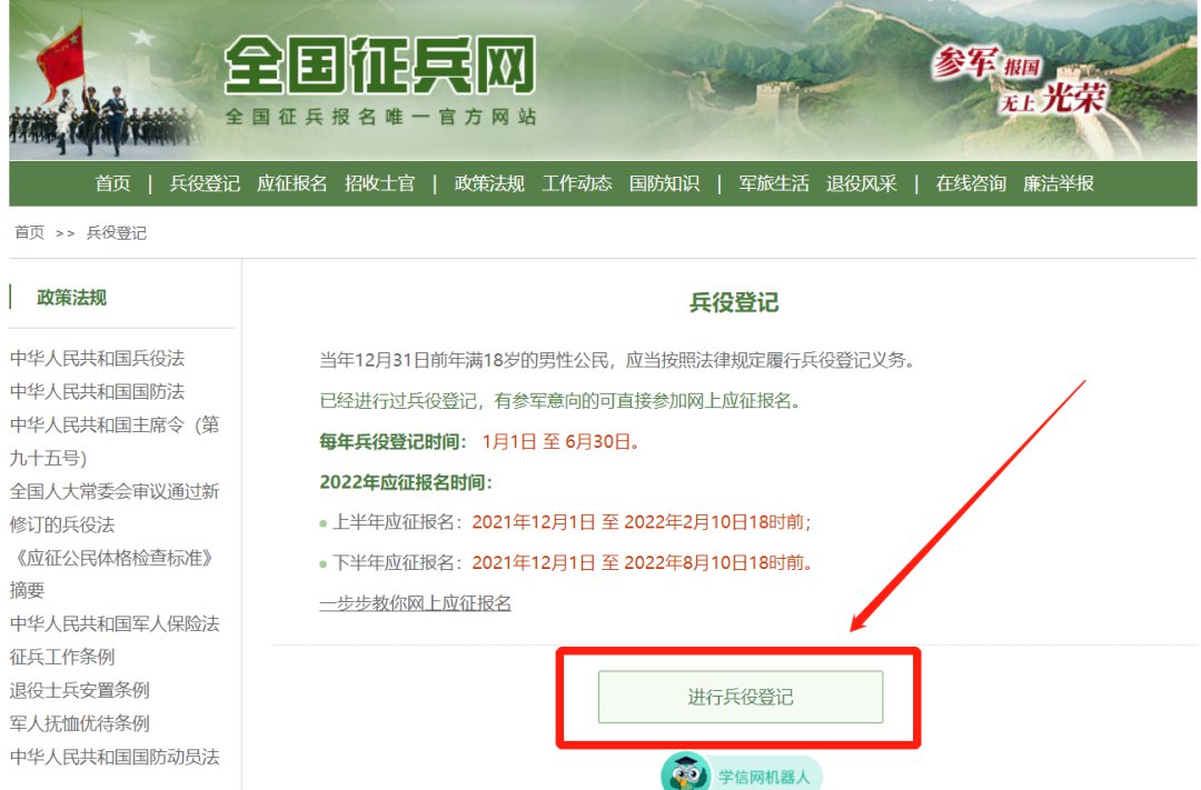在这个页面中,会告知报名时间以及参军政策说明,建议大家认真阅读后,点击“进行兵役登记”,迈出你军旅生涯的第一步哦!