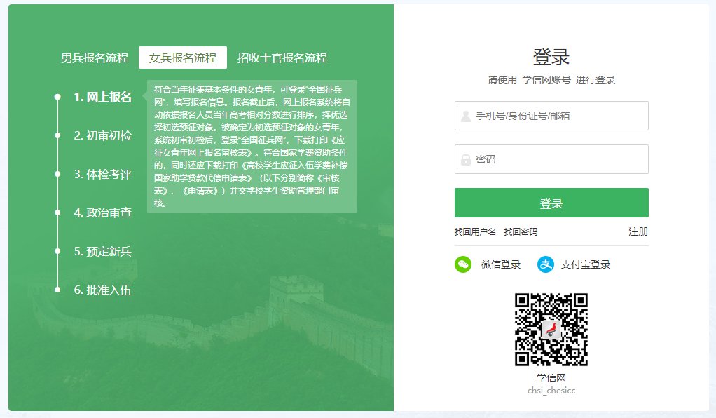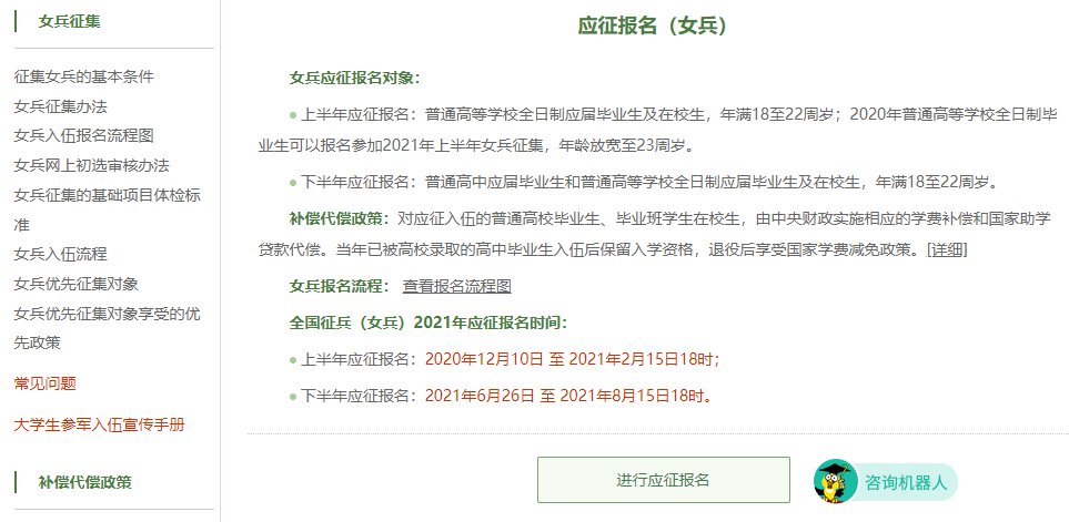 1)在全国征兵网(https://www.gfbzb.gov.cn/)首页右侧,点击“兵役登记(女兵)”