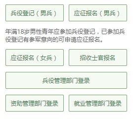 有些小伙伴看到这么多的菜单就有些懵了,其实不用紧张,如果你是第一次来的男生,直接从“兵役登记(男兵)”进入页面就可以了;否则就从“应征报名(男兵)”进入页面。