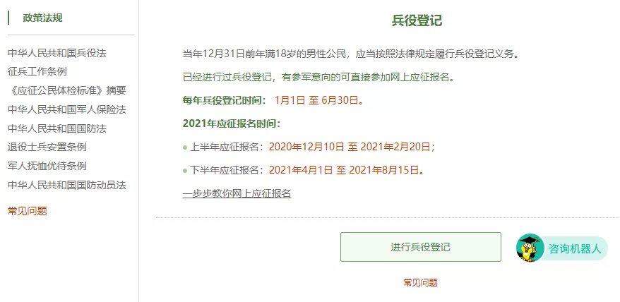 在这个页面中,会告知我们报名时间以及参军的政策说明,建议看后,点击“进行兵役登记”,迈出你军旅生涯的第一步吧!