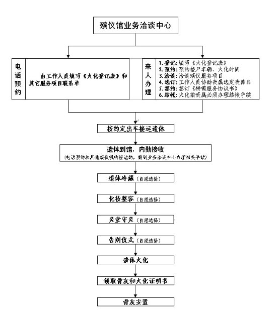 非工作时间应丧属要求提供接运遗体、冰柜,礼厅接待,遗体火化等殡仪服务的,按规定收取非工作时间劳务费。根据规定,遗体必须由殡仪馆专用车运送,私自用其他车运送,本馆不予受理并上报有关部门查处。因此,丧属有需求,要及时来人或来电同殡仪馆联系