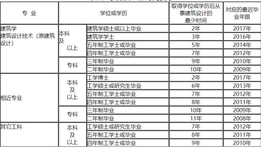 (2)不具备下表所规定学历的申请报名考试人员应从事工程设计工作满15年且应具备下列条件之一: