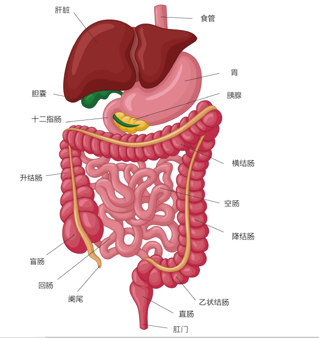 升结肠:它从一个叫做盲肠的小袋开始,食物经过小肠消化和吸收后,在此处排入大肠。它在腹部的右侧向上延伸。