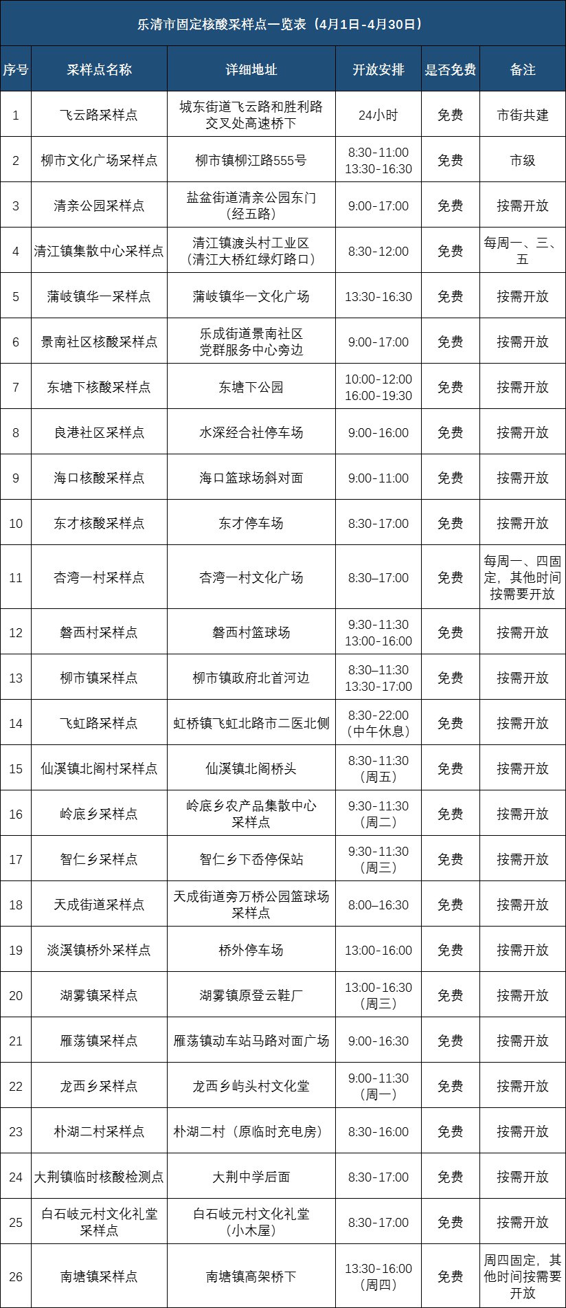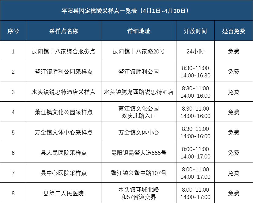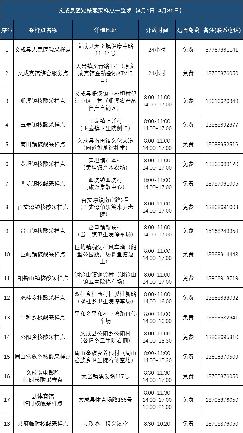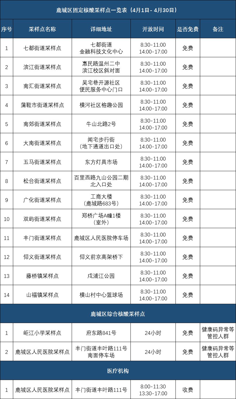 为持续做好疫情防控工作,满足各类人员的核酸检测需要,我市4月份省市级医院和各地的核酸采样点信息公布如下: