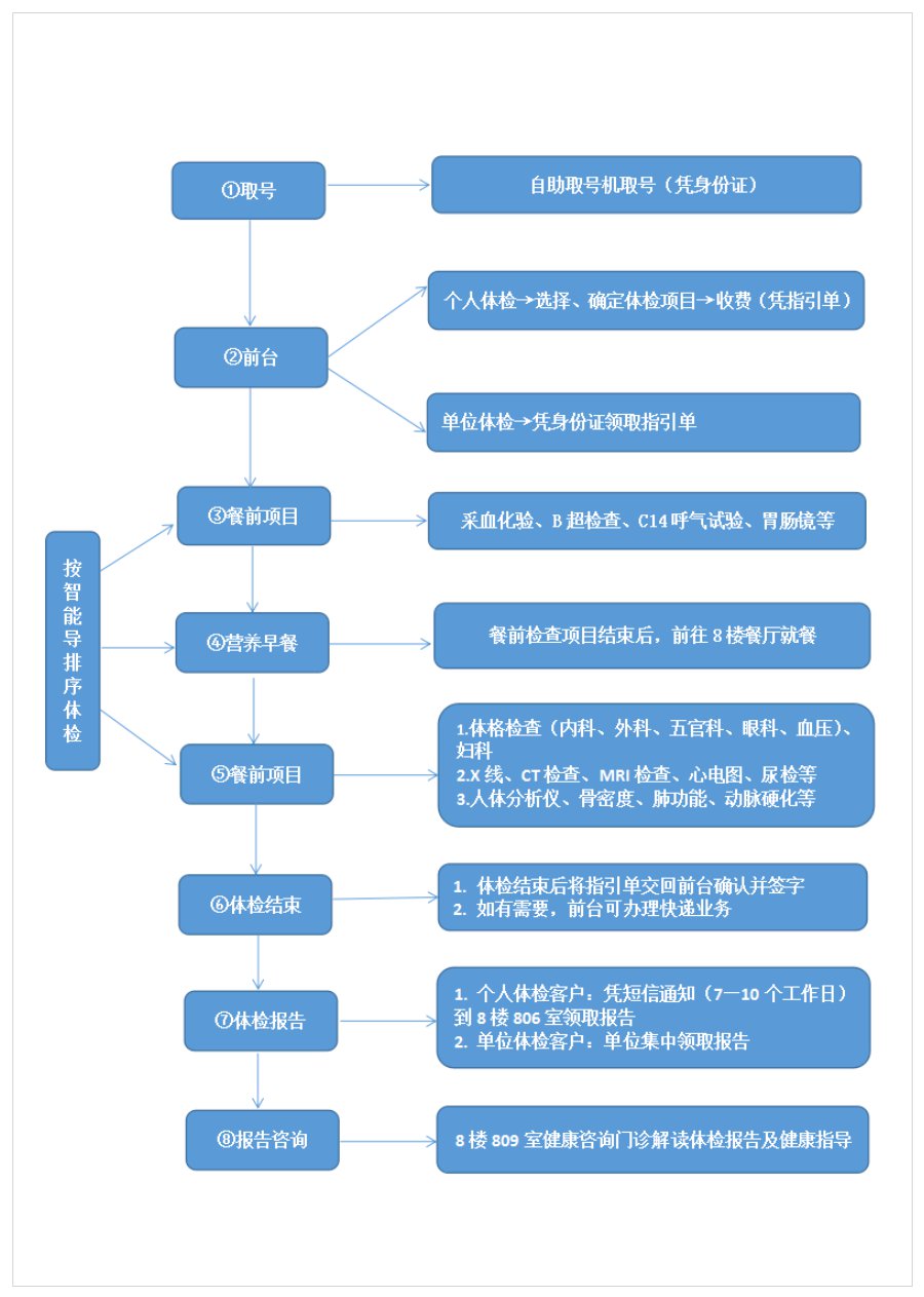 7、体检完毕后,请将指引单交回7楼前台,以确认所有项目均已完成,以防漏检,并将及时对您的体检结果进行总检。
