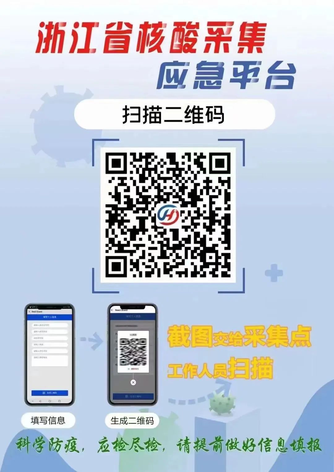 1.请提前在“浙江省核酸采集应急平台”登记信息,注意信息登记的准确性、完整性。