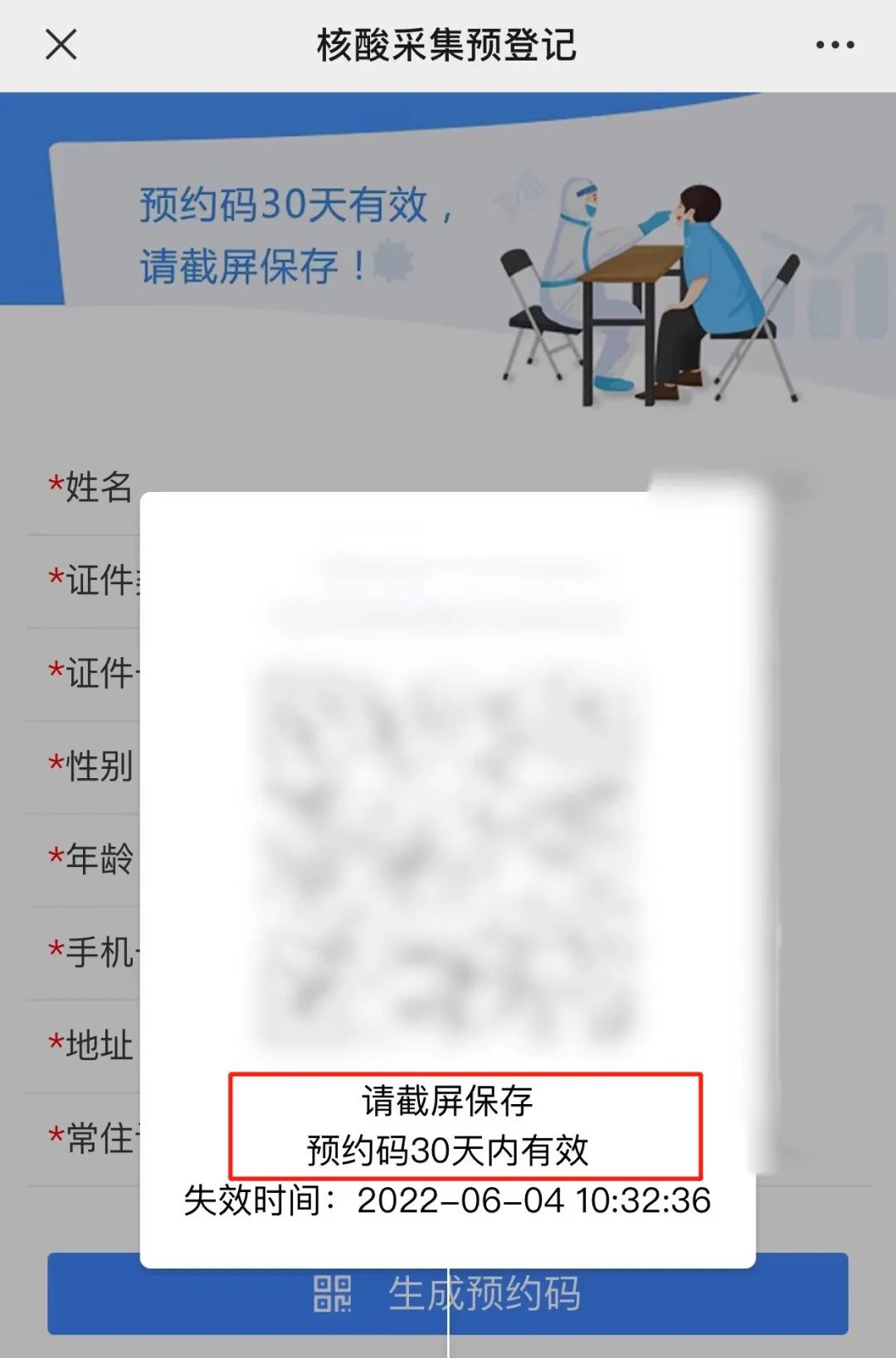 ②如实填写信息并点击生成预约码
