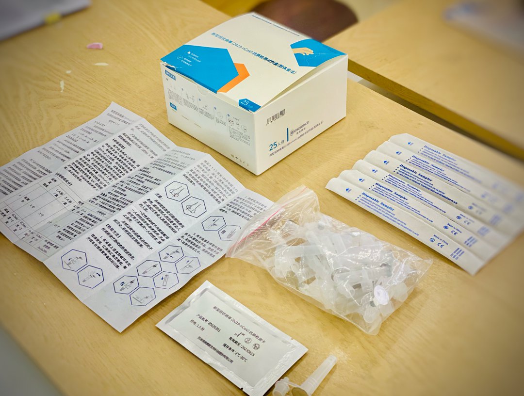 ▲自测试剂盒包含了无菌的一次性采样拭子、样本处理液、检测卡和说明书